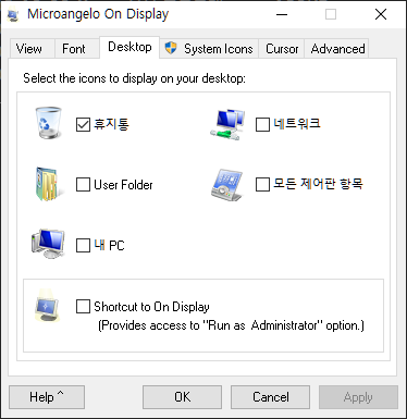 5) 세번째 탭은 데스크탑 배경화면에 표시할 기본 아이콘이에요. 전 휴지통만 ㅎㅎ
